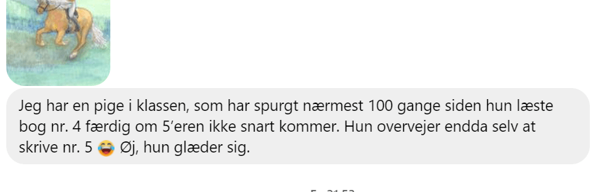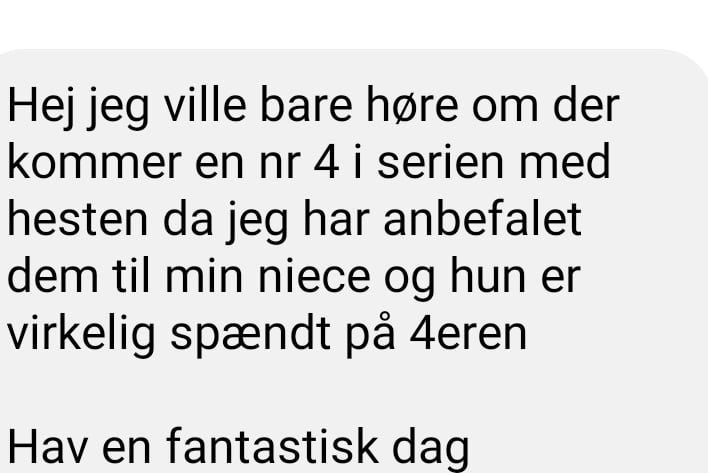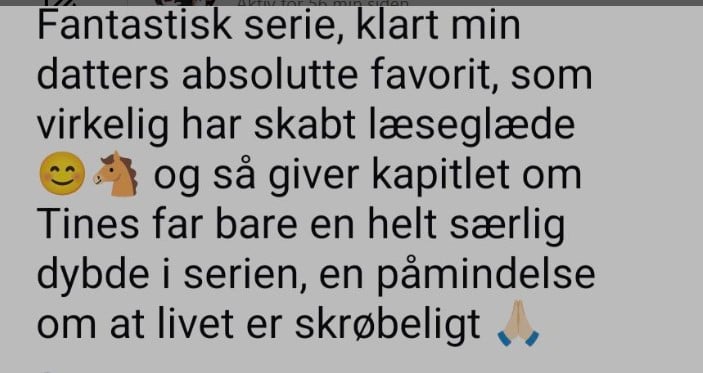 "Hej Mette. Din bog er fantastisk. Vi glæder os til en 2'er. Min datter er fuldstændig opslugt. Hun læser og læser. Jeg lagde ud med at læse lidt, og nu har hun selv læst den to gange. Har aldrig oplevet hende have så stor læselyst før. Vi er fan."
